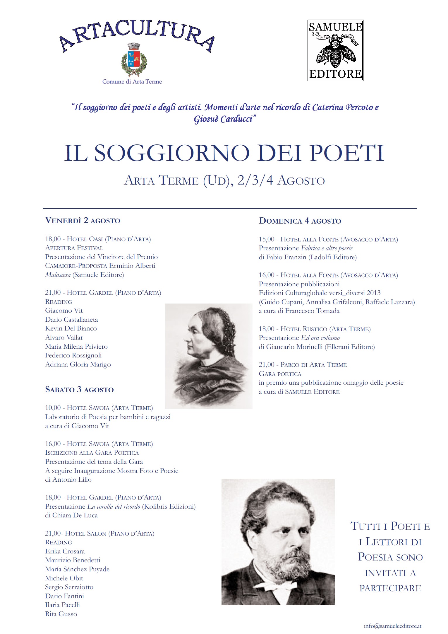 Nasce, ad Arta Terme di Udine, terra dove soggiornarono Carducci, Percoto, Pasolini, il Festival di Poesia IL SOGGIORNO DEI POETI. Il 2, 3, 4 agosto si svolgerà la prima edizione di un festival che ha la natura di un ritiro di poeti aperto al pubblico. Per 3 giorni una ventina di scrittori vivranno ospiti del Comune e in questo leggeranno i propri versi, presenteranno i propri libri, si sfideranno in una gara poetica con in premio una pubblicazione offerta dalla Samuele Editore. E dal titolare della Samuele Editore, Alessandro Canzian, direttore artistico della manifestazione, le parole di ringraziamento al Comune e All’assessorato alla Cultura di Arta: “In un momento di profondissima crisi, nel quale si vedeva sempre il fondo del pozzo da due o tre anni, per poi scoprire che il fondo era sempre più in basso, nasce un interesse, una voglia di poesia. Ad Arta come in tutta Italia. Perchè oltre alla ben nota Pordenonelegge, alla festa di Poesia di Pordenone, l’Italia proprio in questi giorni ha visto il festival Notturni di_versi, il festival Parco Poesia, e tante altre più o meno grandi manifestazioni incentrate sulla parola. Una parola che può servire a uscire dalla crisi, a trovare nuovi punti di riferimento. E in quest’ottica va veramente applaudito l’impegno economico, di risorse, di tempo, del Comune di Arta Terme e in particolare dell’Assessore alla cultura che ha voluto, ha cercato, di costruire un festival di parole, di poesia. Perchè siano questi i momenti, più o meno criticati, del rilancio, del ritrovamento di sè stessi e della propria posizione in Italia. Anche attraverso un rifugio poetico, un soggiorno dove ascoltare e confrontarsi con altri poeti. Un Comune e un Assessore coraggiosi, non possono essere definiti altrimenti, e che cercheremo di onorare col nostro lavoro, certi di portare poeti di spessore, conosciuti e meno conosciuti, ma sempre ottimi”.