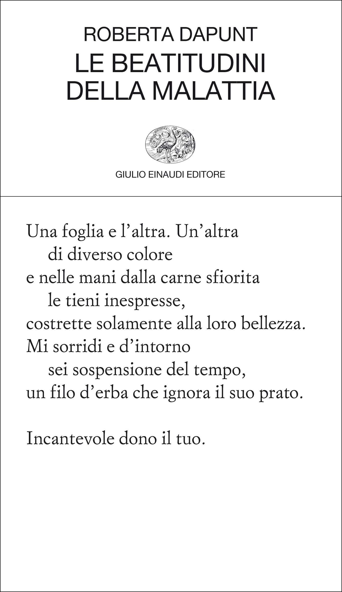 Le beatitudini della malattia di Roberta Dapunt (che con Einaudi aveva già pubblicato La terra più del paradiso nel 2008) è un libro che ho incontrato per caso, e che mi ha coinvolto e convinto. Sarà che ha in sé caratteristiche della poetica di Cucchi, sopratutto dell’ultimo suo volume in versi nell’osservazione della sedimentazione umana. Sarà che ricorre nel libro il termine Uma, che in nota viene detto significare Madre ma che l’autrice usa come nome universale, e tanto ricorda l’Onda del Maa Onda vallerughiano. Sarà che comincio ad apprezzare questi libri che gravitano attorno a un tema (o monotema) forte che viene quasi ossessivamente analizzato sotto varie prospettive, e che mi ricorda l’appena letto La morte moglie di Ivano Ferrari. Sarà, infine, che è appena morto Federico Tavan, poeta della diversità e della malattia intesa come malattia mentale che alla fin fine altro non è che un diverso modo di osservare la vita (slegato, o slogato, dai punti di riferimento soliti). Ma questo libro di poesia mi è piaciuto moltissimo.