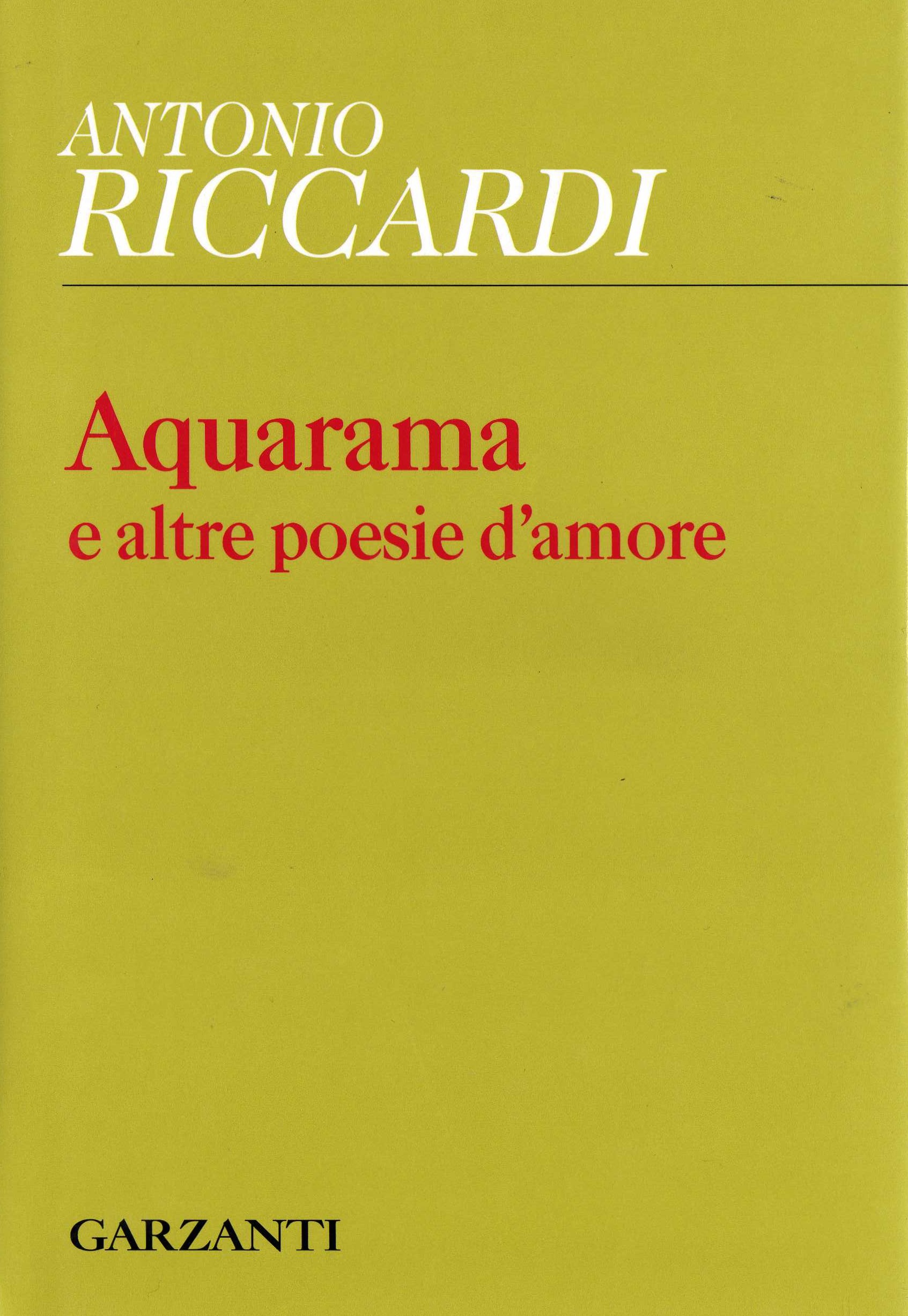 Un altro libro non recentissimo, come quello di Tommaso Di Dio. Volevo comprare qualcosa di Antonio Riccardi, in giuria al Premio Castello di Villalta da poco conclusosi con la vittoria di Stefano Dal Bianco, e mi ha incuriosito il titolo di questo volume edito da Garzanti nel 2009: Aquarama e altre poesie d’amore. Posto che un libro di 96 pagine (di cui circa una quindicina praticamente bianche) non dovrebbe arrivare a costare 19 euro (tanto più che si tratta di poesia) devo riconoscere che l’anno 2009 si prefigura come particolarmente fortunato per le edizioni di poesia.