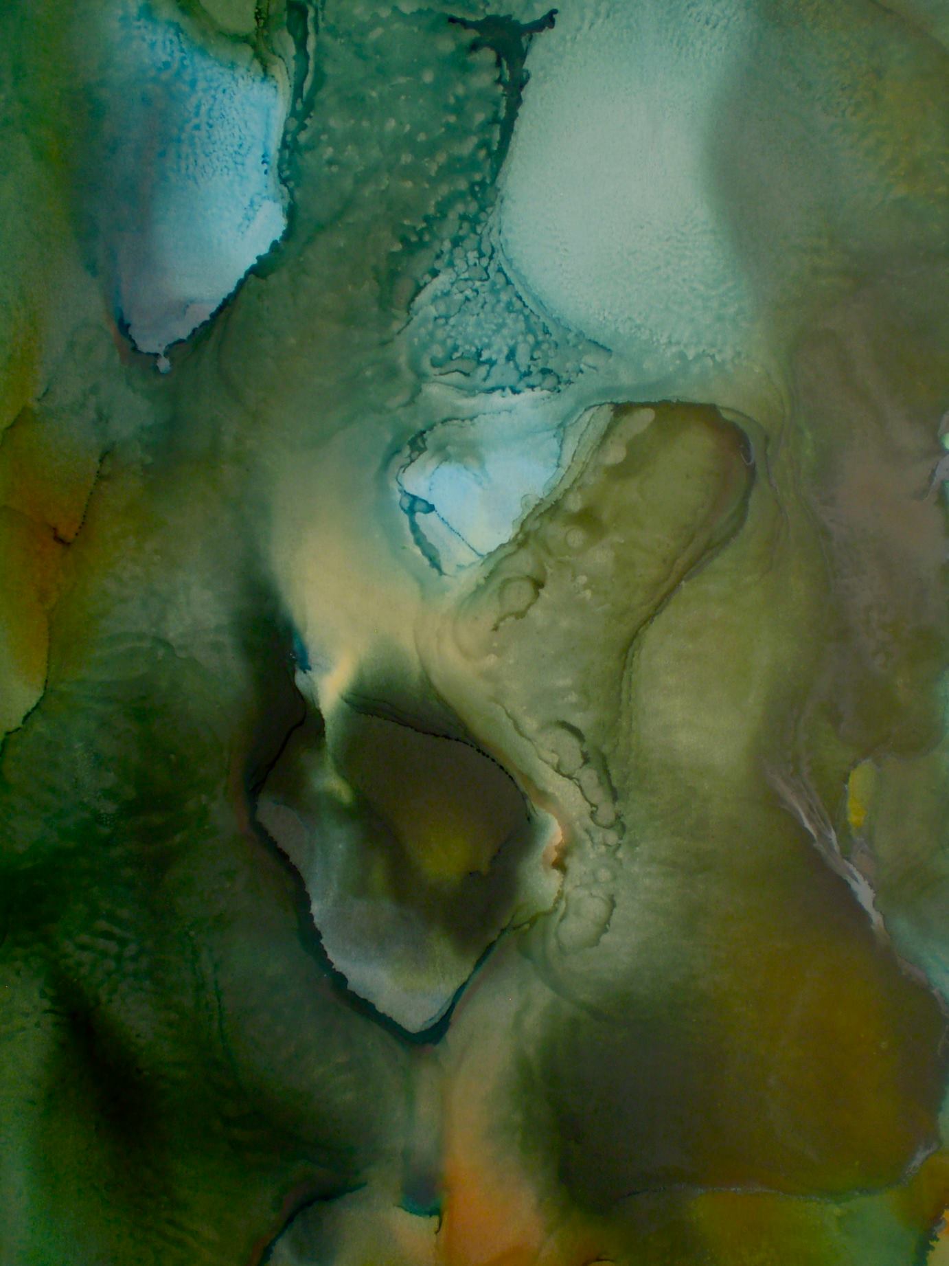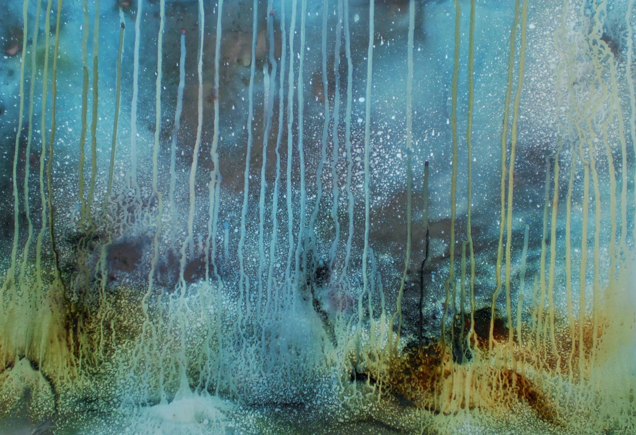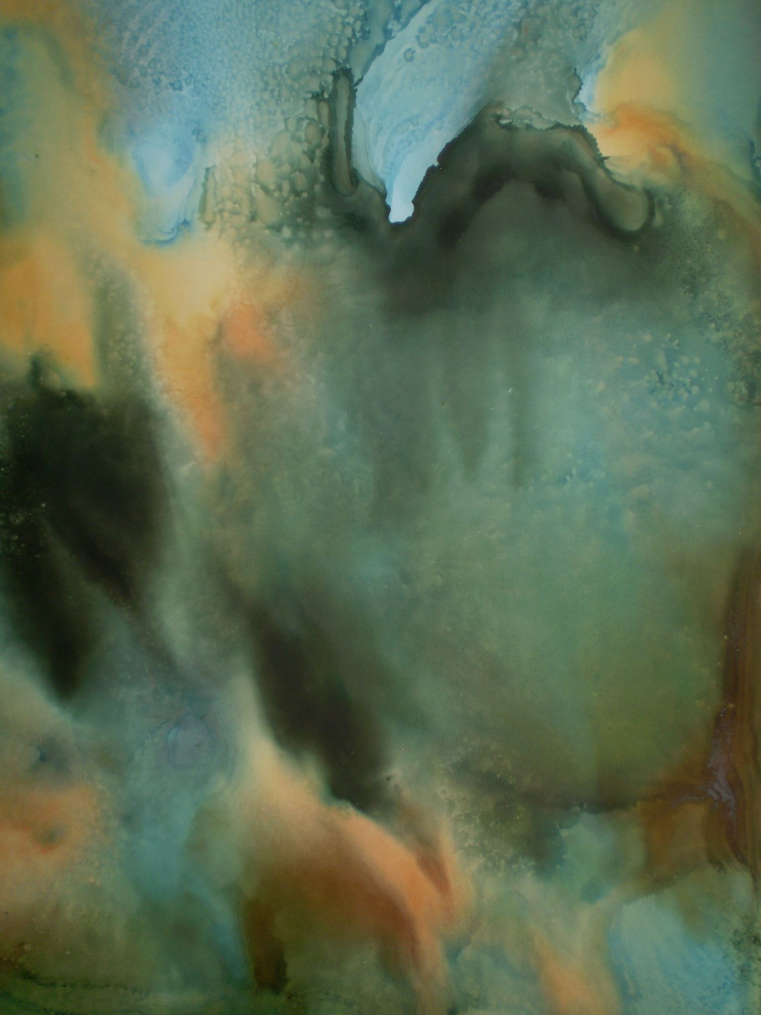 Alcuni quadri ed alcuni testi poetici di Gilberto Del Tedesco, che alcuni giorni fa mi ha offerto un piacevole caffè nella sua casetta tutta di legno in quel di Polcenigo (Pn). Un’ambientazione affascinante come preludio di quadri e poesie che nascono impensabilmente da colature chimiche. Tale è infatti la formazione di Gilberto, che un giorno vedendo alcune gocce cadute su un foglio di carta si è accorto che formavano una forma senza forma, un inizio, un’ispirazione. Da quelle tre gocce è nata una ricerca che mescola chimica e arte, casualità e poesia, in forme espressive che per concludersi impegnano l’autore per giorni e giorni.