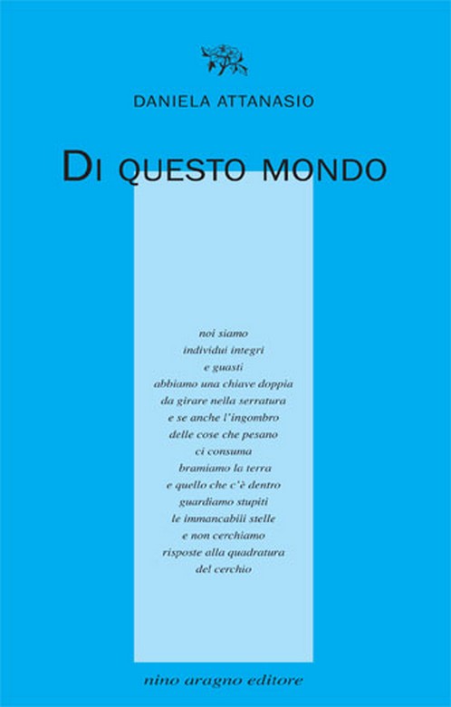 Non tutti i libri di poesia, devo ammetterlo come comunque altre volte l’ho ammesso, mi trovano sempre e comunque favorevole. Io amo la poesia, ne ho fatto il mio lavoro (finchè dura dati i tempi), ma di fronte a certe pagine anche pubblicate da Editori di indubbia levatura resto un po’ perplesso. Che poi il dubbio si scopra in un equilibrio precario tra l’incertezza di non capire ciò che leggo per mia incapacità e l’incertezza che può provenire oggettivamente dal testo stesso, questo è un altro discorso. Tempo fa ho recensito la carissima Livia Chandra Candiani (la recensione qui – poi ho conosciuto di persona Chandra, donna dolcissima e delicatissima) e similmente ad ora avevo prefato dicendo che quella non era esattamente la poesia che amo, ma che ne riconoscevo la statura. Ancor di più adesso di fronte a Di questo mondo di Daniela Attanasio (Nino Aragno Editore, 2013), devo ammettere che mi è necessario fare un passo indietro e confessare di non riuscire a capirlo completamente. È una poesia di cui fatico a trovare l’obiettivo, lo sguardo specifico. Ripeto il dubbio è che sia io a non riuscire a trovarne i punti cardinali.