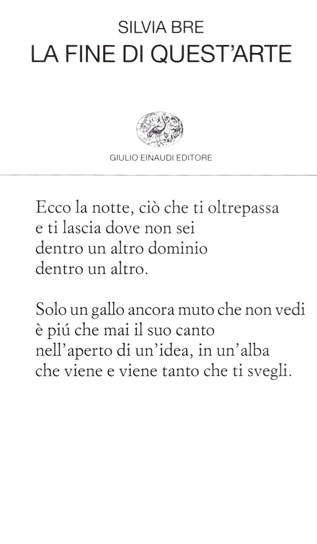 Silvia Bre in La fine di quest’arte (Einaudi 2015) consegna delle pagine scivolose, precise ma inafferrabili, impietose. Poesie che si allargano al mondo, che lo guardano, che dimostrano la loro capacità di tradurlo ma a riccio si chiudono nella loro esattezza, nella loro oscurità di fondo: E io maledetta che ho scelto / la sua parte, quel buio senza ritegno / in cui cadere, / la fine di quest’arte.
