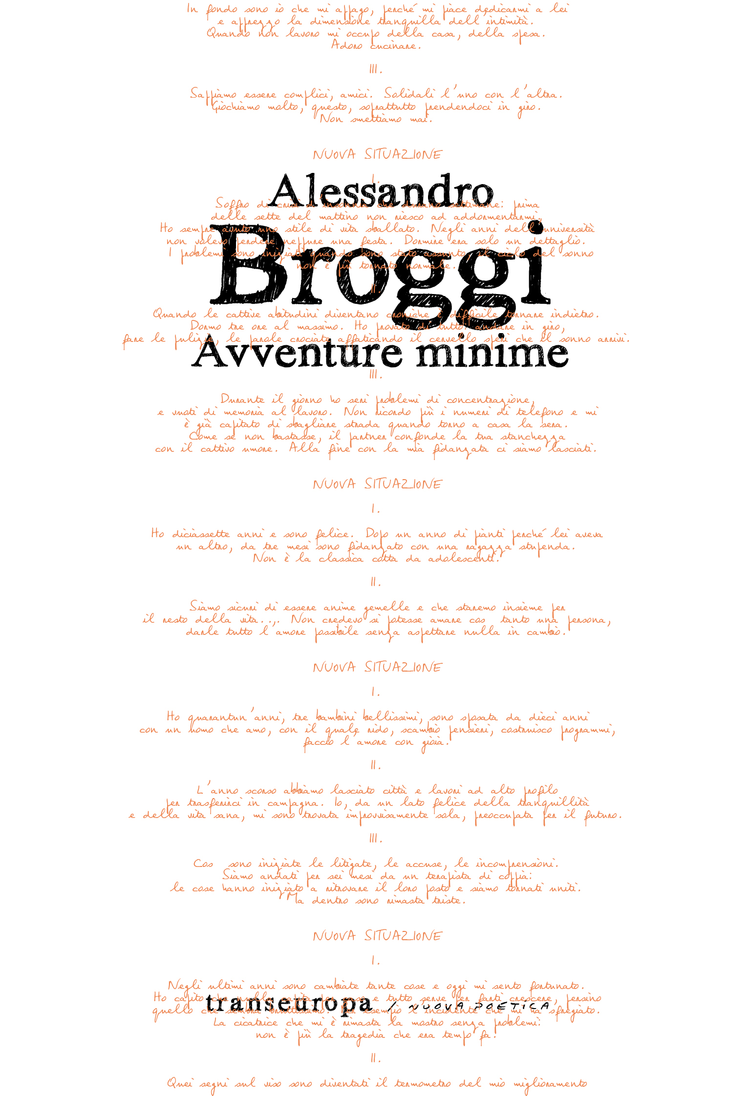 Una lettura sicuramente non semplice e mai scontata quella che Alessandro Broggi chiede al lettore nel suo Avventure minime (Transeuropa 2013). Un libro di poesia che tenta di riscrivere i canoni non esternando la propria prospettiva privata quanto interiorizzando tutte le altre. Avventure minime è infatti una raccolta di flash e quadri dal realismo tanto accentuato quanto mai preventivamente giudicato. C’è una descrizione asettica, distante, della realtà, che però viene assunta a un livello tale da far considerare anche la cosa più terribile come normale. Un insieme disgregato di frammenti che però racconta efficacemente il mondo di oggi. Eludendo il verso nella prima parte per prediligere una poetica delle cose, delle situazioni che paiono essere protagonisti a parte. Come se la vita fosse costruita e subita in egual misura dai suoi attori, diventando essa stessa nelle sue molteplici pieghe una terza protagonista da osservare nuda e grezza.