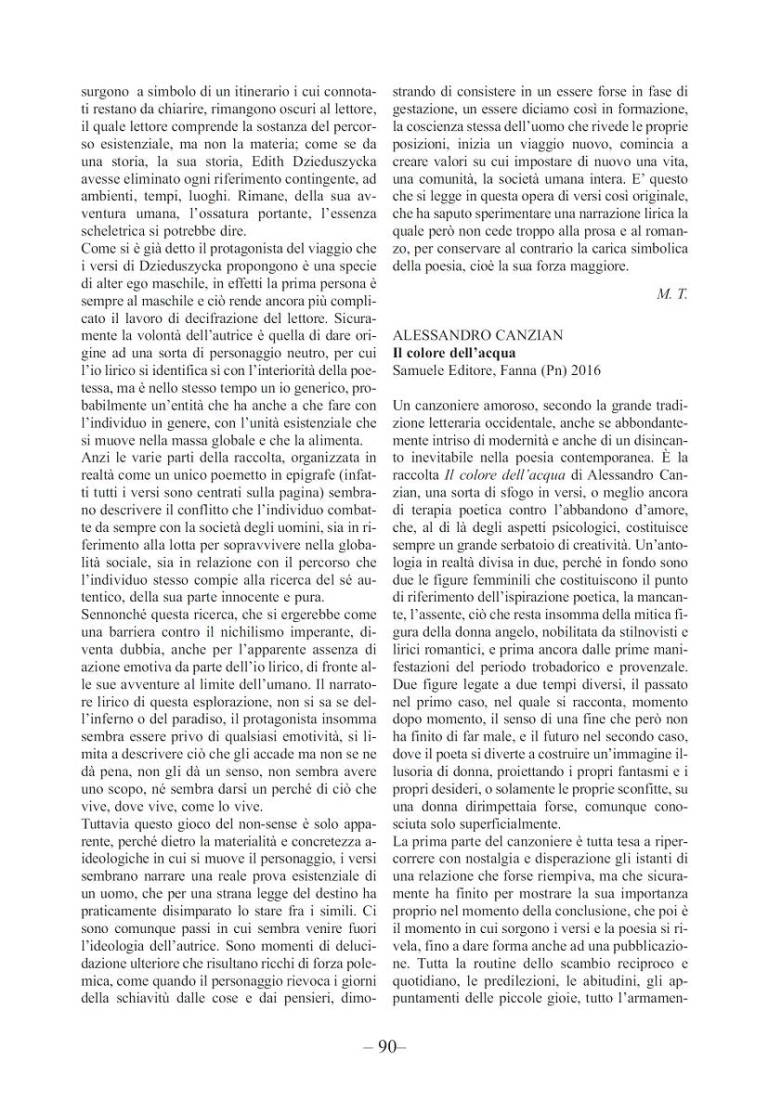 Un canzoniere amoroso, secondo la grande tradizione letteraria occidentale, anche se abbondantemente intriso di modernità e anche di un disincanto inevitabile nella poesia contemporanea. È la raccolta Il colore dell’acqua di Alessandro Canzian, una sorta di sfogo in versi, o meglio ancora di terapia poetica contro l’abbandono d’amore, che, al di là degli aspetti psicologici, costituisce sempre un grande serbatoio di creatività. Un’antologia in realtà divisa in due, perché in fondo sono due le figure femminili che costituiscono il punto di riferimento dell’ispirazione poetica, la mancante, l’assente, ciò che resta insomma della mitica figura della donna angelo, nobilitata da stilnovisti e lirici romantici, e prima ancora dalle prime manifestazioni del periodo trobadorico e provenzale. Due figure legate a due tempi diversi, il passato nel primo caso, nel quale si racconta, momento dopo momento, il senso di una fine che però non ha finito di far male, e il futuro nel secondo caso, dove il poeta si diverte a costruire un’immagine illusoria di donna, proiettando i propri fantasmi e i propri desideri, o solamente le proprie sconfitte, su una donna dirimpettaia forse, comunque conosciuta solo superficialmente.