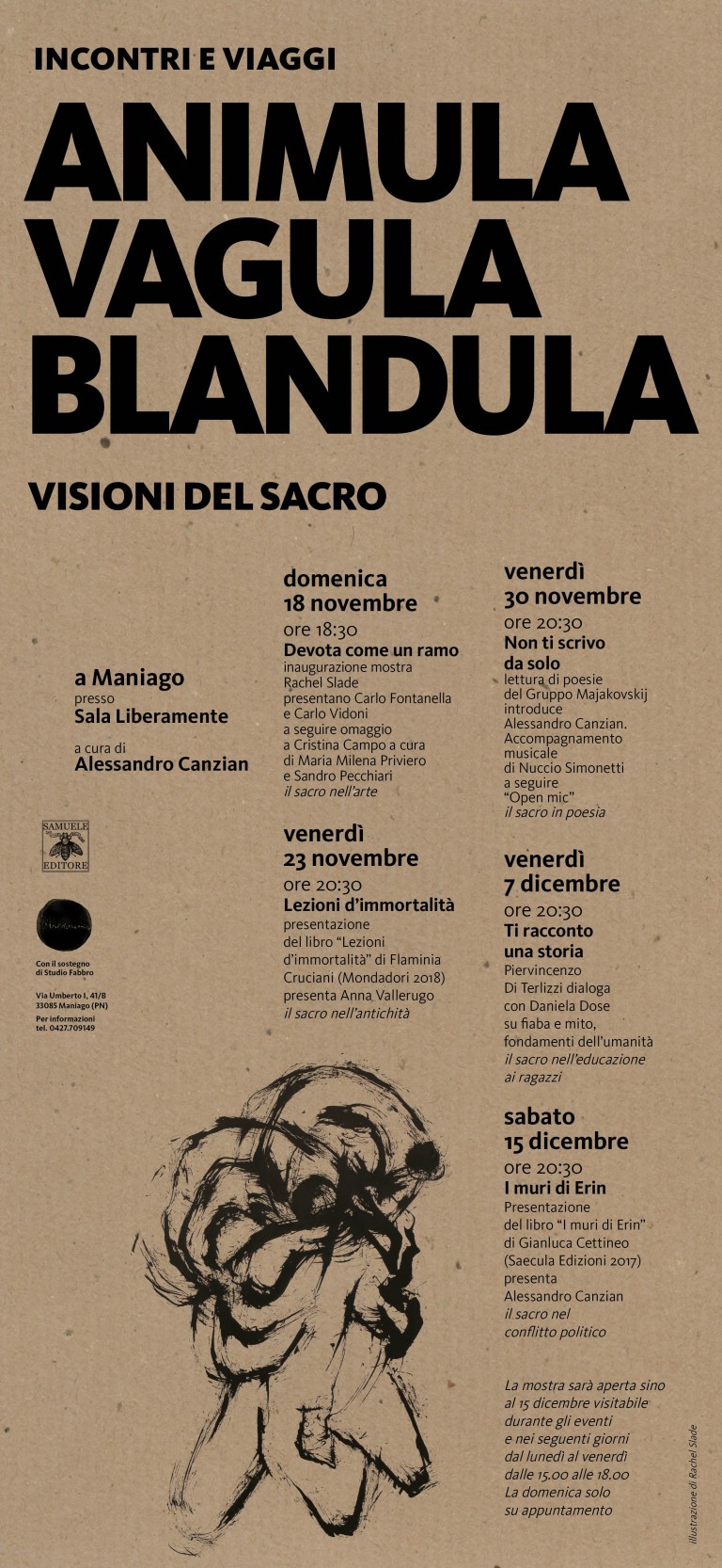 Rachel Slade è nata a Putnam nel Connecticut (USA), vive in Italia dal 2002. La sua attività principale si sviluppa attorno alla pittura. Le sue mostre più recenti sono “Citizen Ship” (Villa Corrier-Dolfin, Porcia PN, 2014, con presentazione di Alessandra Santin), “Crambe Tataria” (Villa Cattaneo, San Quirino PN, 2015, con presentazione di Carlo Vidoni), “Ephemeral” (Teatro Russolo, Portogruaro Ve, in occasione dello spettacolo Cenerentola di Sergei Prokofiev), “La casa apocrifa” (Cantine Collalto, Susegana Tv, con presentazione di Alessandro Canzian). Per la Samuele Editore ha curato la presentazione di alcuni poeti al New York City Poetry Festival del 2014 e diverse copertine della collana Scilla (tra le ultime: Periferie/The Bliss of Hush and Wires di Ilaria Boffa e Nuviçute mê e sûr di Stefano Montello). Come poetessa ha partecipato a diversi eventi letterari: “Residenze Estive” (Trieste), “I poeti scalzi” (Venezia), “Poeti alla Baschiera” (Pordenone), “Callisto” (Venezia). Ha pubblicato in tiratura limitata la plaquette di poesie e disegni “Apocryphal House / La casa apocrifa” (Samuele Editore 2016). Nel 2018 vince il Premio Ossi di Seppia per la poesia.