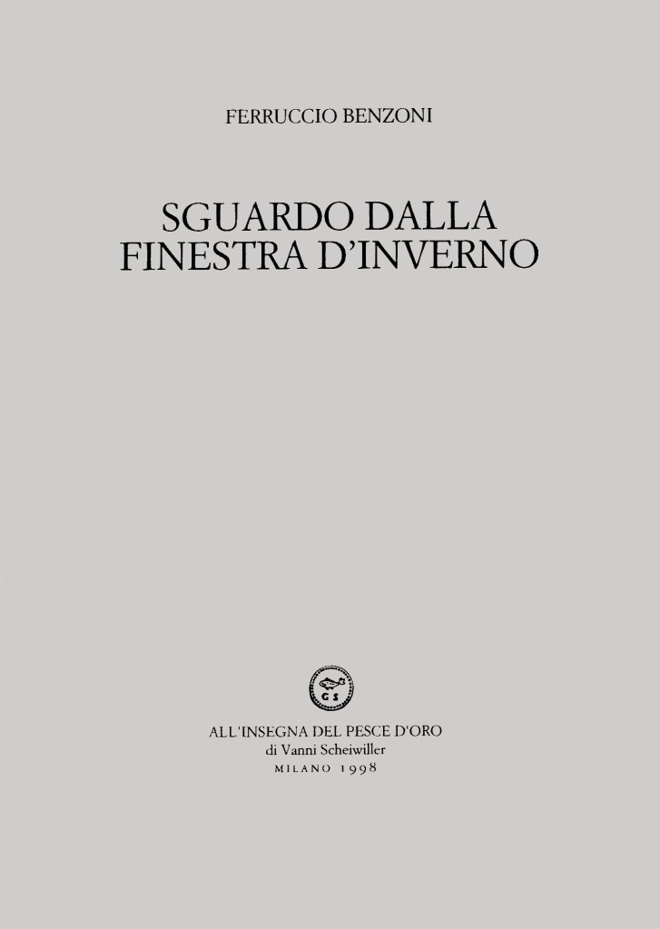 Ho scoperto per caso in un angoletto nascosto di una libreria di provincia Sguardo da una finestra d’inverno di Ferruccio Benzoni (Scheiwiller 1998) ormai molti anni fa. Non ricordo esattamente quando, ma se cerco di ricostruirne la data vedo che nel 2001 ho pubblicato Christabel (Edizioni del Leone, quarta di copertina di Paolo Ruffilli) e ancora non lo citavo. L’ho inserito però nel mio libriccino successivo, La sera, la serra (tip. Mazzoli 2004, prefazione di Tita Paternostro) e poi nel Canzoniere inutile (Samuele Editore 2010, prefazione di Elio Pecora).