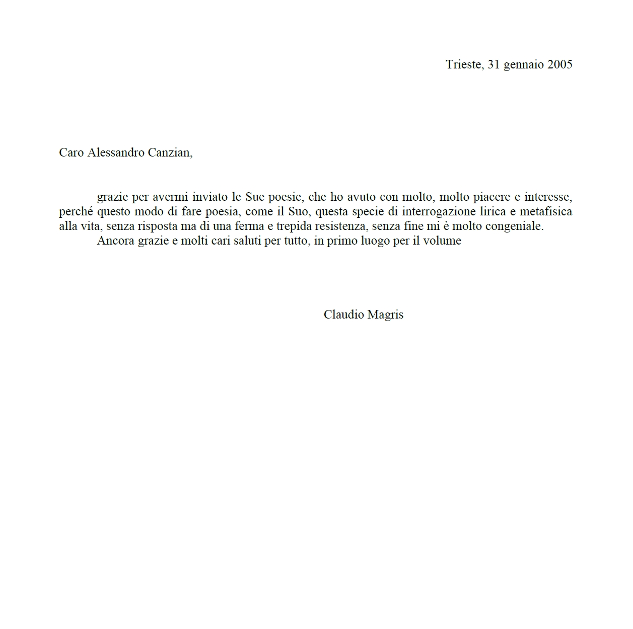 27 aprile 2021 Due vecchie lettere Ritrovo per caso queste due lettere, del 2002 e 2005, di Giorgio Bàrberi Squarotti e Claudio Magris su alcuni miei versi. Quanti anni sono passati… Condividi: Fai clic per condividere su Facebook (Si apre in una nuova finestra) Facebook Fai clic per condividere su X (Si apre in una nuova finestra) X Fai clic qui per condividere su LinkedIn (Si apre in una nuova finestra) LinkedIn Fai clic per condividere su WhatsApp (Si apre in una nuova finestra) WhatsApp Fai clic per inviare un link a un amico via e-mail (Si apre in una nuova finestra) E-mail Mi piace Caricamento... Correlati