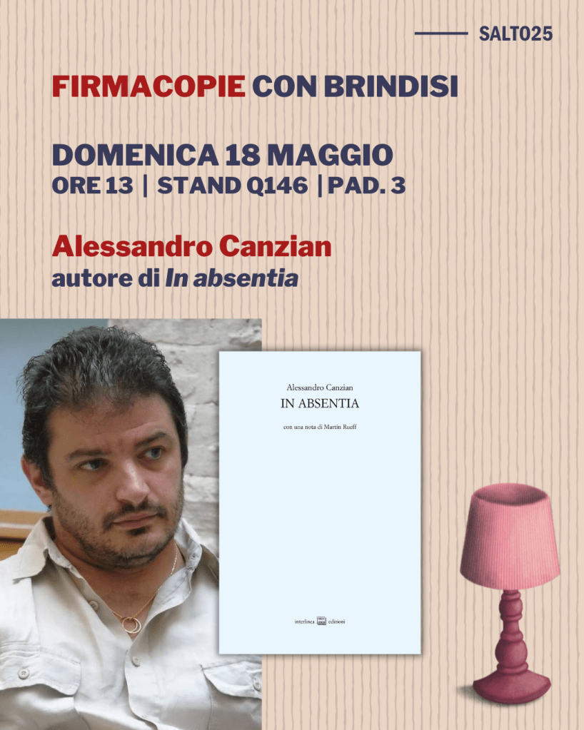 3 Maggio 2025 In absentia: firmacopie al Salone del Libro di Torino 25 Domenica 18 maggio, ore 13:00 Stand Q146. Pad.3 Firmacopie In asbentia Condividi: Condividi su Facebook (Si apre in una nuova finestra) Facebook Condividi su X (Si apre in una nuova finestra) X Condividi su LinkedIn (Si apre in una nuova finestra) LinkedIn Condividi su WhatsApp (Si apre in una nuova finestra) WhatsApp Invia un link a un amico via e-mail (Si apre in una nuova finestra) E-mail Mi piace Caricamento... Correlati